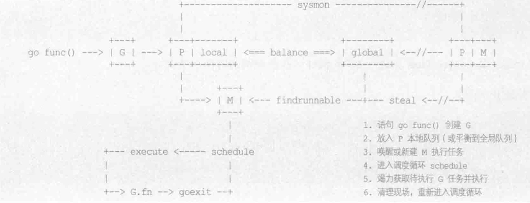 ① G代表着goroutine,P调度器资源,维护G的队列和运行上下文(比如栈、指令指针等),M Machine代表操作系统线程thread,是真正执行G的实体。